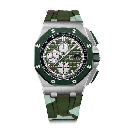 Audemars Piguet Royal Oak Offshore 26400SO.OO.A055CA.01, 44 mm. The watch has Khaki green Dial w/ Royal Oak hands. The Case is Stainless steel w/ 3126 / 3840 Movement w/ 59 jewels, 50 hours power reserve. The Khaki green “Camouflage” rubber strap with pin buckle. The Water-resistant is up to 100m. The Watch comes complete with Audemars Piguet Papers & Box