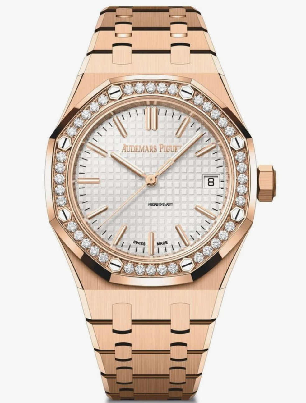 37 mm rose gold case with a white dial and bezel set with diamonds. The bezel is made of rose gold and the diamonds are white in color. The bracelet is also made of rose gold and is adjustable for a comfortable fit. The watch is powered by an automatic movement and is water resistant up to 3m