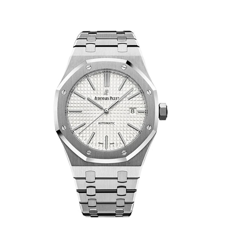 Este reloj mide 41 mm de diámetro y tiene una preciosa caja de acero inoxidable de 9,8 mm de grosor con un cristal de zafiro a prueba de reflejos en la parte posterior. Una corona atornillada, una hermosa esfera plateada con un patrón Grande Tapisserie, marcadores de hora aplicados en oro blanco, manecillas Royal Oak con revestimiento luminiscente y un movimiento automático Calibre 3120 que tiene medición de tiempo de inmersión, horas, minutos, centro. segundos y fecha. Además, este reloj tiene una clasificación de resistencia al agua de 50 metros.