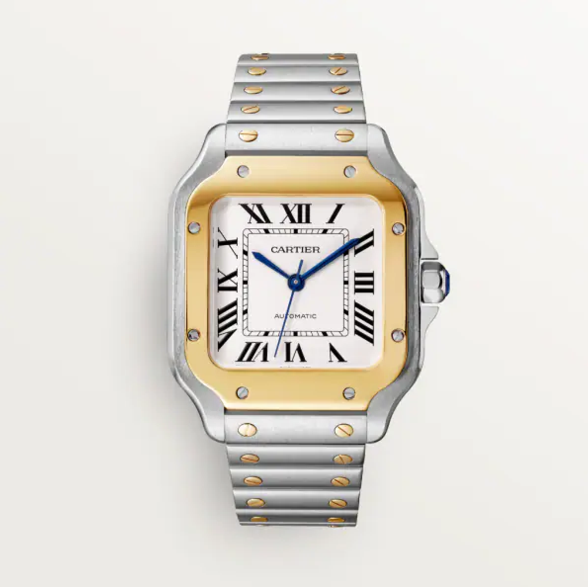 Santos watch, medium model, mechanical movement with automatic winding, calibre 1847 MC. Steel case and yellow gold 750/1000 bezel, 7-sided crown set with a faceted synthetic spinel, silvered opaline dial, blued-steel sword-shaped hands, sapphire crystal. Steel bracelet with “SmartLink” adjustment system. Second bracelet in calfskin, with interchangeable steel folding buckle. Both bracelets are fitted with the “QuickSwitch” interchangeability system. Case width: 35.1 mm, thickness: 8.83 mm. Water-resistant to 10 bar (approx. 100 metres).